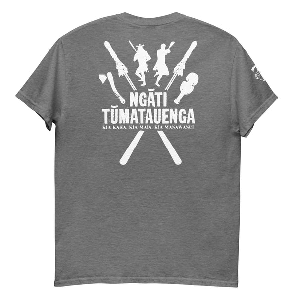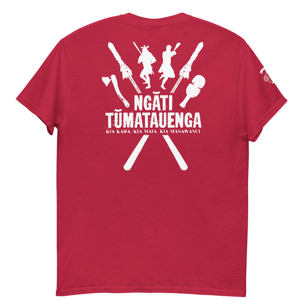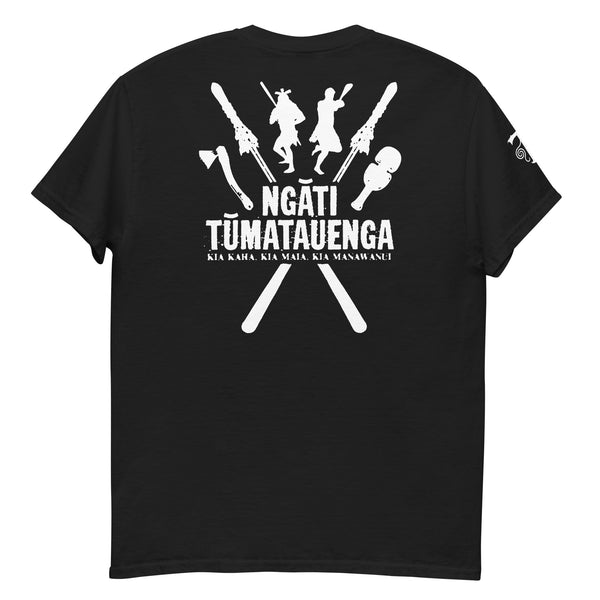 The design features two crossed Taiaha, the revered Maori fighting staffs, which symbolize skill, authority, and guardianship. These are flanked by Maori combat tools: the powerful Tewhatewha axe and the formidable Patu/Mere striking weapon. Figures of Maori warriors, in action, embody the fierce dedication and martial prowess of Tūmatauenga himself. Below this the T-shirt boldly declares "NGĀTI TŪMATAUENGA," inviting you to express allegiance to "The Tribe of the God of War," and inspires with the revered Maori proverb "KIA KAHA, KIA MĀIA, KIA MANAWANUI," meaning "Be strong, be brave, be steadfast"—a timeless testament to unwavering courage and perseverance.